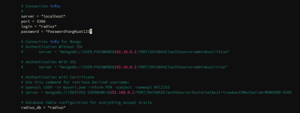 CREATE DATABASE radius; CREATE USER 'radius'@'localhost' IDENTIFIED BY 'PasswordYangKuat123'; GRANT ALL PRIVILEGES ON radius.* TO 'radius'@'localhost'; FLUSH PRIVILEGES; quit;