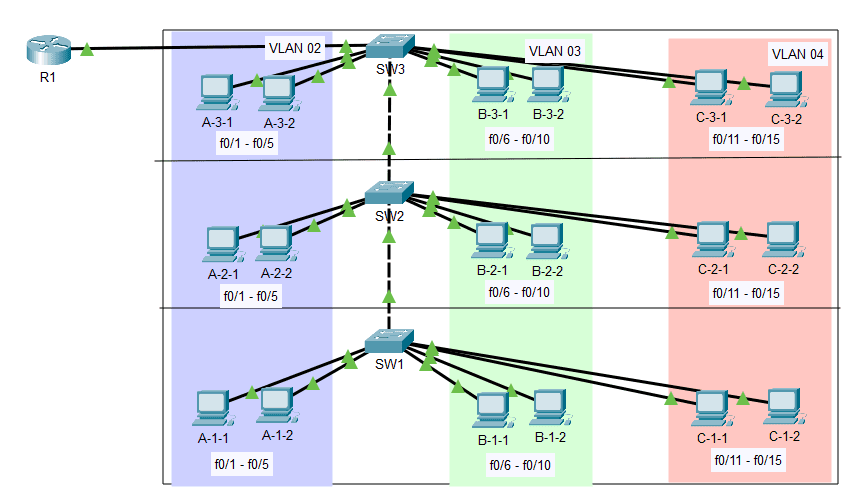 “Terdapat sebuah gedung berlantai tiga. Setiap lantai akan ditempati oleh setidaknya tiga departemen: Dept-A, Dept-B, dan Dept-C. Sebagai seorang teknisi jaringan, Anda akan membagi jaringan menggunakan VLAN sehingga setiap departemen memiliki segmen jaringannya masing-masing.”