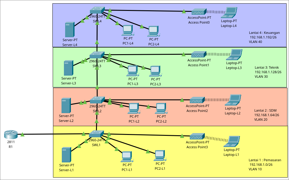 Direktur perusahaan ingin mengembangkan infrastruktur IT di perusahaannya. Perusahaan tersebut berkantor di sebuah gedung 4 lantai. Setiap bagian harus memiliki jaringan yang terpisah, namun tetap saling terkoneksi (dapat berkomunikasi).