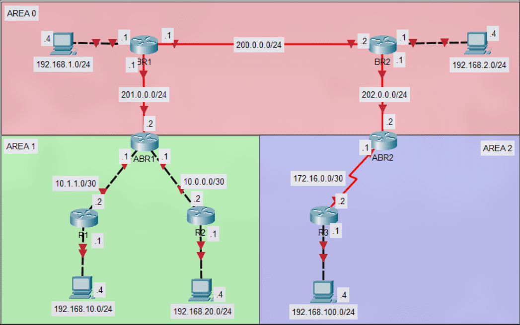 R3(config)#router ospf 1 R3(config-router)#network 192.168.100.0 0.0.0.255 area 2 R3(config-router)#network 172.16.0.0 0.0.0.3 area 2