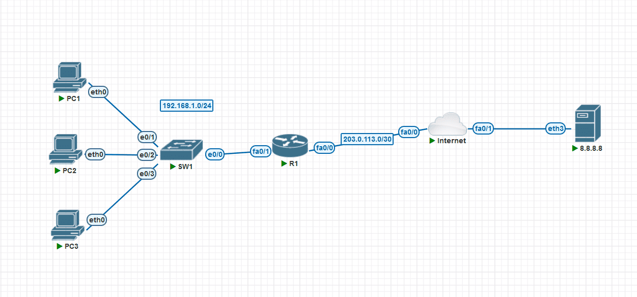Tujuan: Kita mempunyai pool ip public 100.0.0.0/24 Gunakan pool tersebut untuk menkonfigurasi NAT static dengan Mapping IP addresses dari IP LAN 192.168.1.X, PC1, PC2, dan PC3 ke 100.0.0.x/24